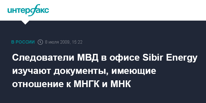 Москва. 8 июля. INTERFAX.RU - Представители следственных органов МВД в офисе Sibir Energy знакомятся с документами, имеющими отношение к ОАО "Московская нефтегазовая компания" (МНГК) по эпизодам 2006 г. и ОАО "Московская нефтяная компания" (МНК) по эпизодам 2002 и 2003 г., говорится в сообщении Sibir Energy.