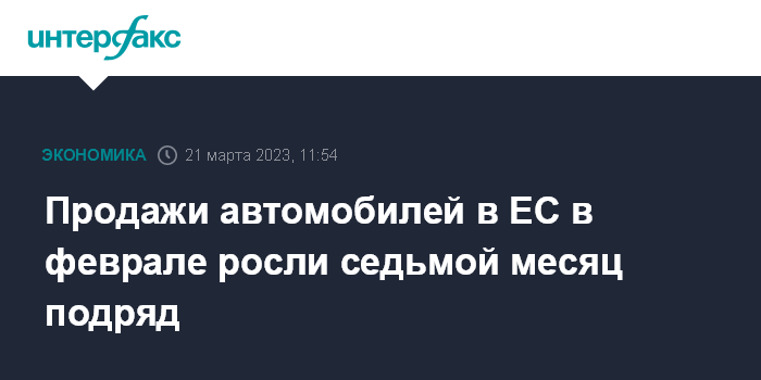 Москва. 21 марта. INTERFAX.RU - В феврале 2023 года продажи машин в Евросоюзе увеличились на 11,5% в годовом измерении и составили 802,8 тысячи, сообщила Европейская ассоциация производителей автомобилей (ACEA).
