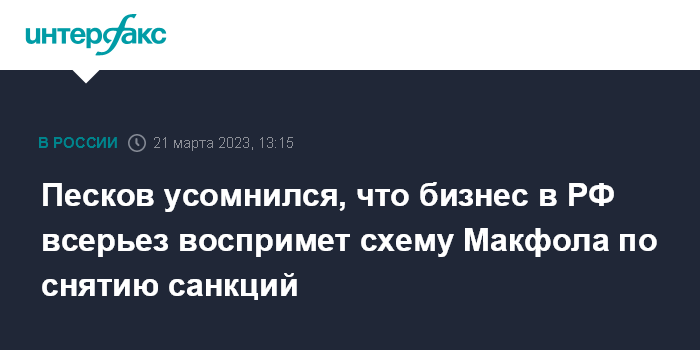 Песков усомнился, что бизнес в РФ всерьез воспримет схему Макфола по снятию санкций