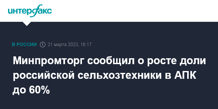 Москва. 21 марта. INTERFAX.RU - Доля отечественной сельхозтехники в российском агропроме в 2022 году достигла 60%, сообщила директор департамента сельскохозяйственного, пищевого и строительно-дорожного машиностроения Минпромторга Мария Елкина на круглом слое в Совете Федерации.