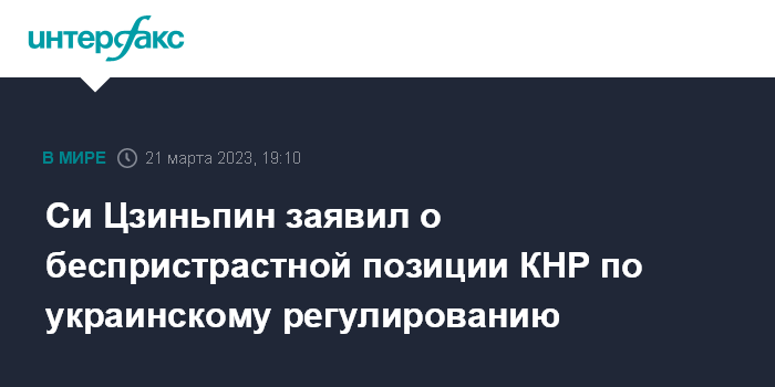 Москва. 21 марта. INTERFAX.RU - Председатель КНР Си Цзиньпин заявил, что в вопросе украинского урегулирования его страна руководствуется целями и принципами Устава ООН, придерживается беспристрастной позиции.