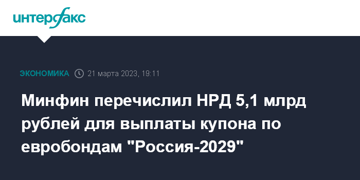 Москва. 21 марта. INTERFAX.RU - Минфин РФ в соответствии с указом президента РФ от 22 июня перечислил в "Национальный расчетный депозитарий" (НРД) 5,1 млрд рублей (эквивалент $65,6 млн) для выплаты купонного дохода по суверенным еврооблигациям РФ со сроком погашения в 2029 году, сообщило министерство.
