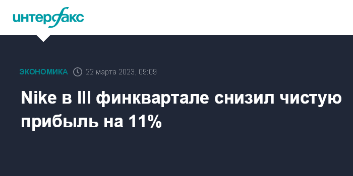 Москва. 22 марта. INTERFAX.RU - Американский производитель спортивных товаров Nike Inc. в третьем квартале 2023 финансового года снизил чистую прибыль на 11%, однако результат превзошел консенсус-прогноз.