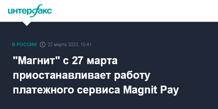 "Сервис Magnit Pay приостанавливает свою работу с 27 марта. Карты будут недоступны для использования. Просим до 27 марта потратить или вывести остаток денег с карты Magnit Pay", - говорится в обращении к клиентам, размещенном на сайте компании.