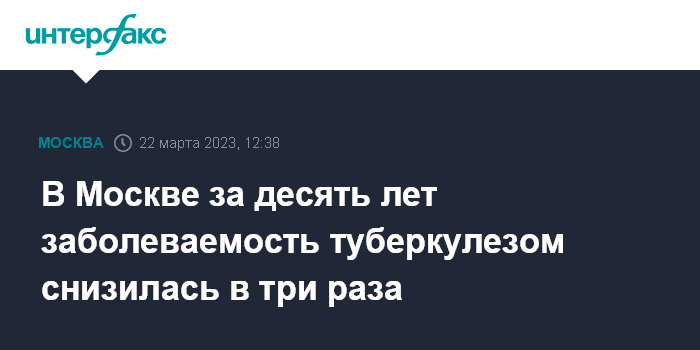 Москва. 22 марта. INTERFAX.RU - В Москве за последние десять лет заболеваемость туберкулезом снизилась в три раза, сообщила в среду главный фтизиатр Департамента здравоохранения столицы, директор Московского городского научно-практического центра борьбы с туберкулезом Елена Богородская.