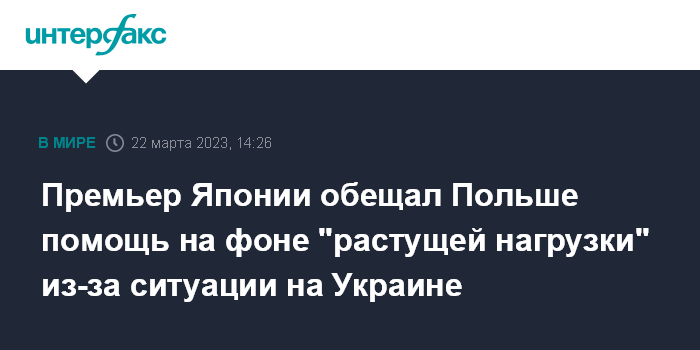 Москва. 22 марта. INTERFAX.RU - Японский премьер-министр Фумио Кисида в среду заявил, что его страна будет помогать Польше преодолеть негативные последствия, вызванные ситуацией на Украине, сообщает агентство Associated Press.