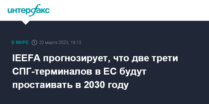 Москва. 22 марта. INTERFAX.RU - Почти две трети мощностей европейских терминалов сжиженного природного газа (СПГ) могут оказаться невостребованными к 2030 году, говорится в исследовании Института энергетической экономики и финансового анализа (IEEFA).