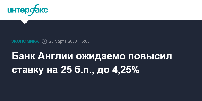Москва. 23 марта. INTERFAX.RU - Банк Англии по итогам мартовского заседания принял решение повысить базовую процентную ставку на 25 базисных пунктов, до 4,25% с 4% годовых, как и ожидало большинство аналитиков.