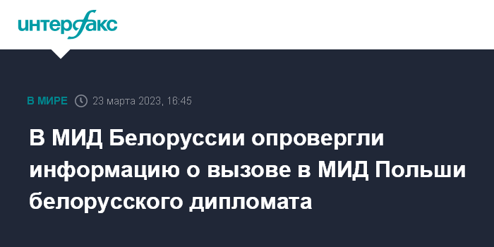 Москва. 23 марта. INTERFAX.RU - В МИД Белоруссии опровергли информацию о вызове в МИД Польши белорусского дипломата в связи с задержанием граждан этой страны по подозрению в шпионаже.