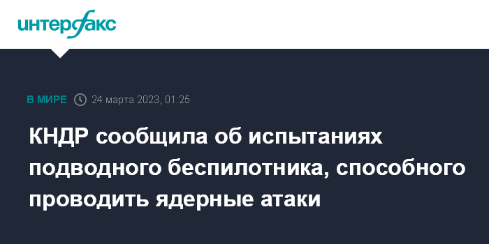 Отмечается, что речь идет о запуске 23 марта "беспилотника для осуществления подводных ядерных атак". В ходе учений он использовал неядерную, "учебную", боеголовку, отмечают южнокорейские СМИ.