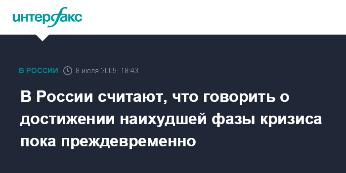 Москва. 8 июля. INTERFAX.RU – В России считают преждевременным мнение о том, что глобальный финансовый кризис уже достиг своей наихудшей фазы.