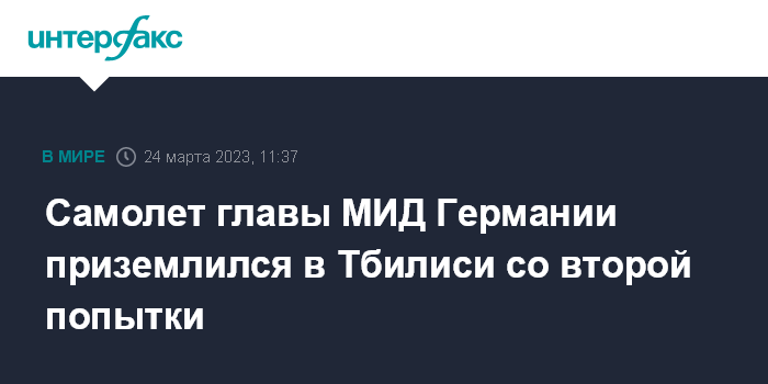 Москва. 24 марта. INTERFAX.RU - Министр иностранных дел ФРГ Анналена Бербок прибыла с первым официальным визитом в Грузию, однако ее самолет смог приземлиться в Тбилиси в ночь на пятницу только со второй попытки.