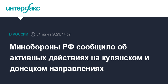 Москва. 24 марта. INTERFAX.RU - Российские войска в течение минувших суток активно действовали на купянском и донецком направлениях, сообщил официальный представитель министерства обороны РФ Игорь Конашенков.