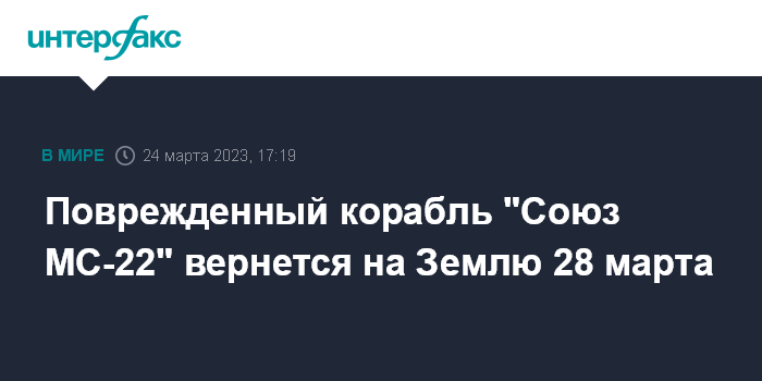 Москва. 24 марта. INTERFAX.RU - Корабль "Союз МС-22" с поврежденным радиатором спустят на Землю с Международной космической станции (МКС) в беспилотном режиме 28 марта, сообщили в "Роскосмосе".