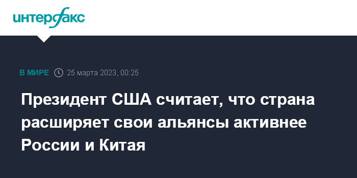 Москва. 25 марта. INTERFAX.RU - США и их партнеры расширяют сеть союзников успешнее России и Китая, заявил американский президент Джо Байден.
