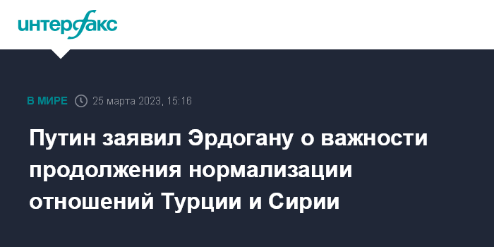 Москва. 25 марта. INTERFAX.RU - Президент РФ Владимир Путин в ходе телефонного разговора с турецким лидером Реджепом Тайипом Эрдоганом обсудил сирийскую проблематику.