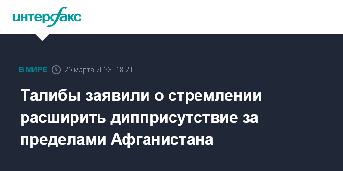 Москва. 25 марта. INTERFAX.RU - Находящееся у власти в Афганистане движение "Талибан" (запрещенная в РФ террористическая организация) нацелено на то, чтобы направить своих дипломатов в ряд новых стран, заявил в субботу официальный представитель талибов Забихулла Муджахид.