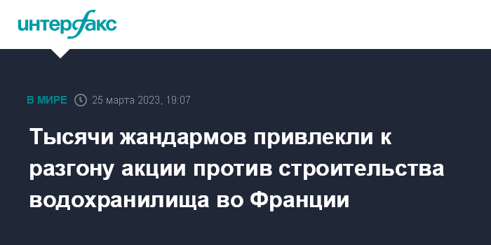 Москва. 25 марта. INTERFAX.RU - Более 3 тыс. сотрудников жандармерии задействованы в разгоне масштабной акции протеста против властей в районе города Сент-Солин на западе Франции, сообщило в субботу местное телевидение.
