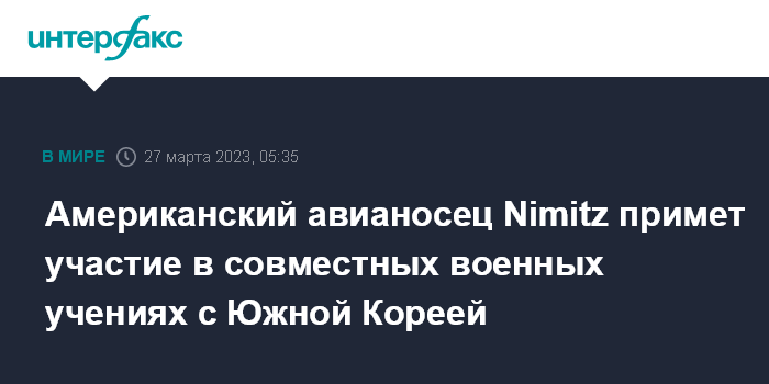 Москва. 27 марта. INTERFAX.RU - Американский авианосец Nimitz проведет учения в водах к югу от Корейского полуострова в понедельник, сообщает министерство обороны Южной Кореи.