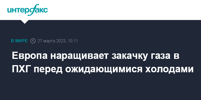 Москва. 27 марта. INTERFAX.RU - Европейские хранилища природного газа показали четыре дня подряд непрерывной нетто-закачки газа благодаря теплой погоде.