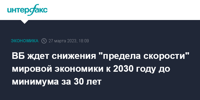 Москва. 27 марта. INTERFAX.RU - "Предел скорости" мировой экономики - максимальные долгосрочные темпы, которыми она может расти, не провоцируя инфляцию - к 2030 году упадет до самого низкого значения за тридцать лет, прогнозирует Всемирный банк.