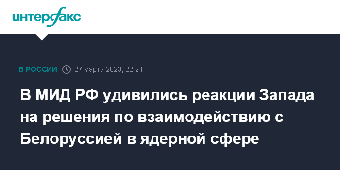 Москва. 27 марта. INTERFAX.RU - В МИД РФ заявили, что недоумевают относительно реакции ряда стран Запада на решения относительно развития взаимодействия с Белоруссией в военной ядерной сфере.