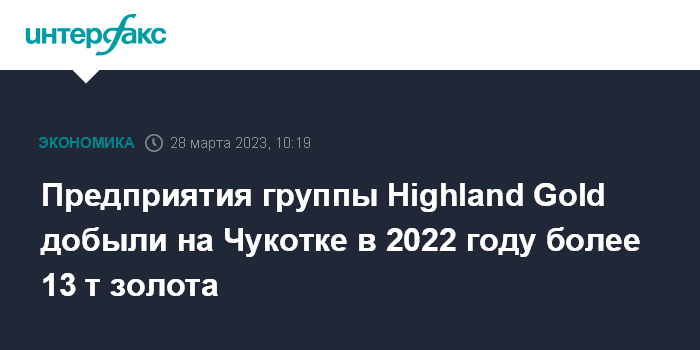 Москва. 28 марта. INTERFAX.RU - Предприятия группы Highland Gold Mining (HGM) в 2022 году добыли на Чукотке более 13 тонн золота, сообщил гендиректор и владелец компании Владислав Свиблов, выступая на совещании вице-премьера - полпреда президента в ДФО Юрия Трутнева с инвесторами Чукотки.