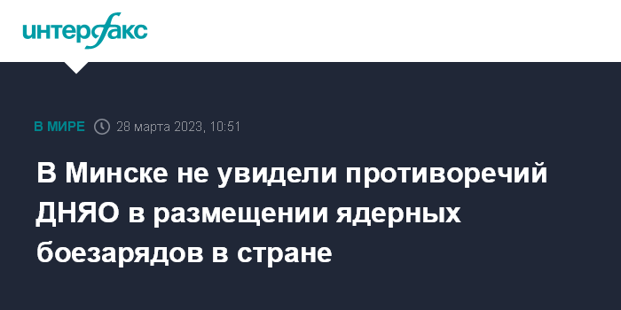 Москва. 28 марта. INTERFAX.RU - В Минске заявили, что не считают нарушением Договора о нераспространении ядерного оружия (ДНЯО) факт размещения на территории страны ядерных боезарядов.