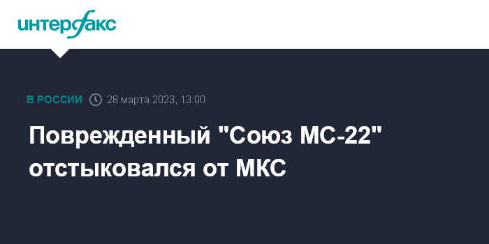 Москва. 28 марта. INTERFAX.RU - Корабль "Союз МС-22" с поврежденным радиатором отстыковался от Международной космической станции (МКС) в беспилотном режиме перед последующей посадкой в Казахстане, сообщает корреспондент "Интерфакса" из Центра управления полетами (ЦУП).