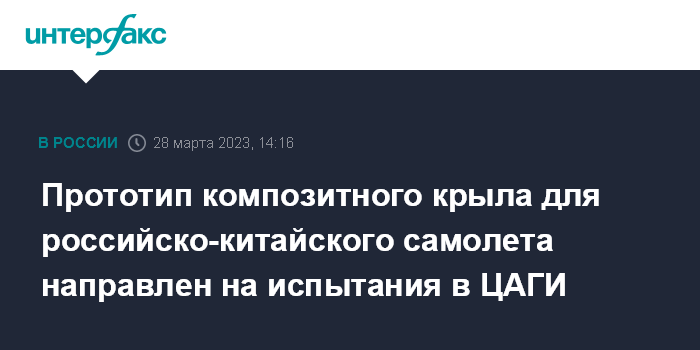 Прототип композитного крыла для российско-китайского самолета направлен на испытания в ЦАГИ