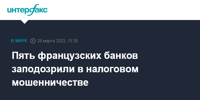Москва. 28 марта. INTERFAX.RU - Во Франции ведется расследование против пяти банков, которые подозреваются в налоговом мошенничестве. Об этом сообщила газета Le Figaro со ссылкой на национальную финансовую прокуратуру (PNF).