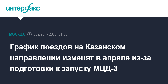 Москва. 28 марта. INTERFAX.RU - Расписание поездов изменится на Казанском направлении Московской железной дороги с 5 по 26 апреля из-за подготовки к запуску МЦД-3 (Московские центральные диаметры). Часть поездов будет отменена, а интервалы увеличат до 20-40 минут. Об этом говорится в сообщении, опубликованном в телеграм-канале столичного департамента транспорта.