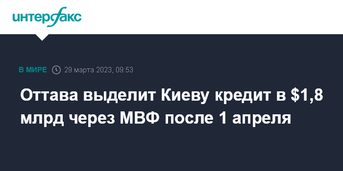 Москва. 29 марта. INTERFAX.RU - Канада в 2023-2024 финансовом году (начнется 1 апреля) собирается предоставить Украине кредит на сумму $1,8 млрд (2,4 млрд канадских долларов) по линии Международного валютного фонда, сообщает CBC со ссылкой проект бюджета страны, внесенный в парламент министром финансов Христей Фриланд.