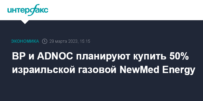 Москва. 29 марта. INTERFAX.RU - Британская BP Plc и Национальная нефтяная компания Абу-Даби (ADNOC) создадут совместное предприятие в сфере добычи природного газа и сделают предложение о покупке 50% акций израильской NewMed Energy в рамках сделки на сумму около $2 млрд, сообщает Bloomberg.