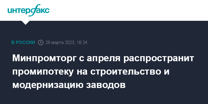 Москва. 29 марта. INTERFAX.RU - Минпромторг с апреля распространит механизм промышленной ипотеки на цели строительства, реконструкции, модернизации производственных площадок, заявил заместитель директора департамента региональной промышленной политики ведомства Леонид Данилов.