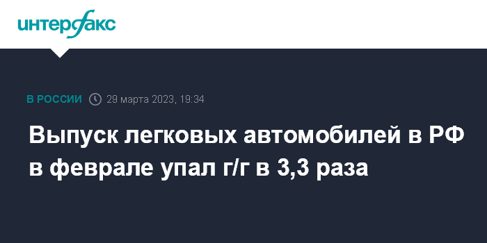 Москва. 29 марта. INTERFAX.RU - Производство легковых автомобилей в России в феврале 2023 года упало в годовом выражении на 69,9% (до 32,5 тыс. шт.), превысив традиционно низкий январский показатель на 52,6%, следует из данных Федеральной службы государственной статистики РФ (Росстат).