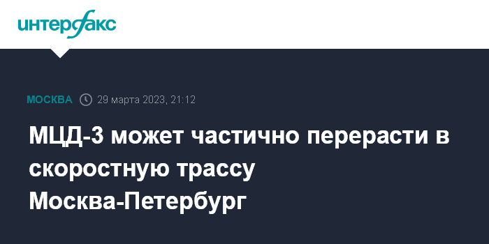 Москва. 29 марта. INTERFAX.RU - Третья линия Московского центрального диаметра (МЦД-3, D3), соединяющая Ленинградское и Казанское направления железной дороги, в перспективе может частично перерасти в высокоскоростную магистраль до Санкт-Петербурга, сообщил в среду мэр Москвы Сергей Собянин.