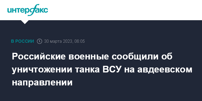Москва. 30 марта. INTERFAX.RU - Российские военные на авдеевском направлении уничтожили замаскированный танк ВСУ, сообщил начальник пресс-центра группировки "Юг" Иван Бигма.