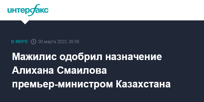 Москва. 30 марта. INTERFAX.RU - Президент Казахстана Касым-Жомарт Токаев, выступая в мажилисе, предложил на пост премьер-министра республики кандидатуру Алихана Смаилова. Депутаты утвердили это назначение и вскоре президент подписал соответствующий указ.
