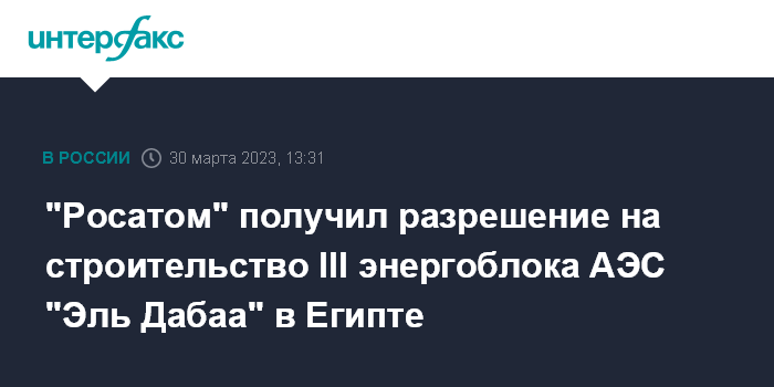 Москва. 30 марта. INTERFAX.RU - "Росатом" получил разрешение на строительство третьего энергоблока АЭС "Эль Дабаа" в Египте, сообщило корпоративное издание "Страна Росатом".