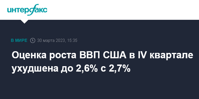 Москва. 30 марта. INTERFAX.RU - Экономика США в четвертом квартале 2022 года выросла на 2,6% в пересчете на годовые темпы. Таковы окончательные данные министерства торговли США.