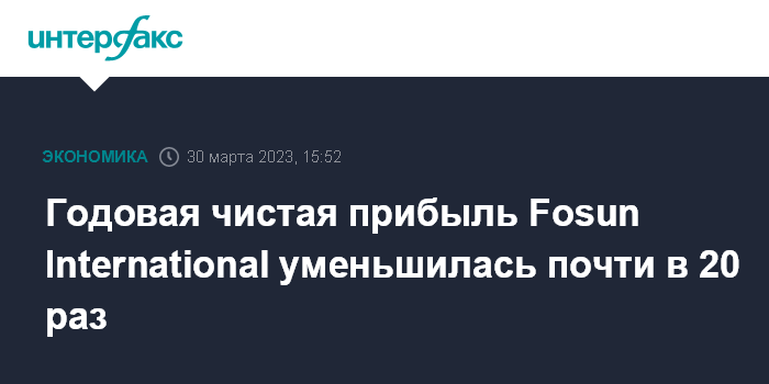 Москва. 30 марта. INTERFAX.RU - Китайский конгломерат Fosun International Ltd. сократил чистую прибыль по итогам 2022 года почти в 20 раз на фоне пандемии и неблагоприятной конъюнктуры на рынках капитала, сообщается в отчетности и презентации компании.