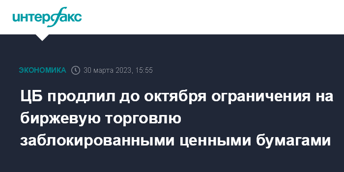Москва. 30 марта. INTERFAX.RU - Банк России еще на шесть месяцев ограничил обращение части иностранных ценных бумаг, заблокированных международными депозитариями, которые ранее были выведены на неторговые счета, сообщается в пресс-релизе регулятора.
