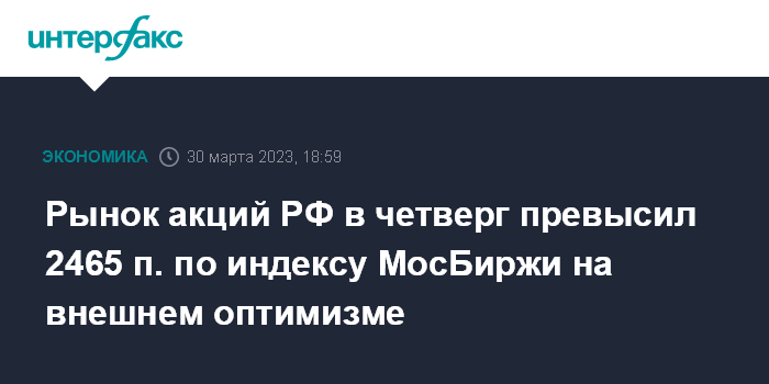 Москва. 30 марта. INTERFAX.RU - Рынок акций РФ в четверг умеренно подрос по основным индексам вслед за подъемом мировых фондовых площадок и нефти на надеждах завершения банковского кризиса в США и Европе; индекс МосБиржи превысил 2465 пунктов, завершив ростом пятые торги подряд и обновив пик на закрытие с сентября, при этом динамика blue chips оказалась смешанной из-за выборочной фиксации прибыли игроками.