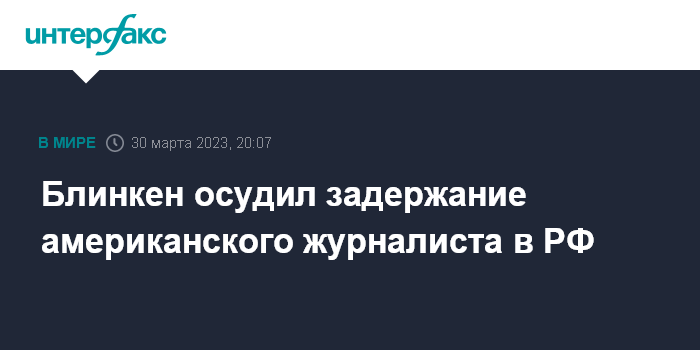 Москва. 30 марта. INTERFAX.RU - Госсекретарь США Энтони Блинкен заявил в четверг, что осуждает задержание в России корреспондента The Wall Street Journal Эвана Гершковича, в очередной раз призвал всех американцев покинуть РФ.
