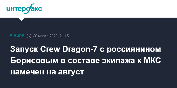 Москва. 30 марта. INTERFAX.RU - Запуск американского пилотируемого корабля Crew Dragon-7 с космонавтом "Роскосмоса" Константином Борисовым в составе экипажа к Международной космической станции (МКС) намечен на август этого года, сообщило в четверг NASA.