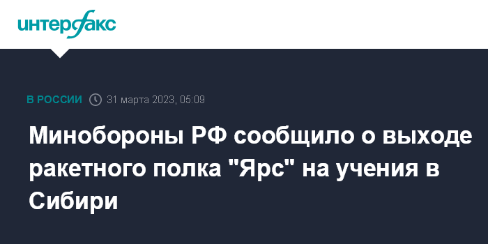 Москва. 31 марта. INTERFAX.RU - Российские военные заявили, что в рамках проведения командно-штабного учения на маршруты боевого патрулирования вышел очередной ракетный полк ПГРК "Ярс".