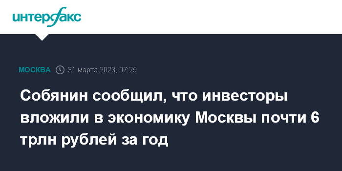 Москва. 31 марта. INTERFAX.RU - Вложения инвесторов в экономику столицы по итогам прошлого года составили почти 6 трлн рублей, инвестиции в основной капитал города стабильно растут, несмотря на санкции, сообщил в своем телеграм-канале мэр Москвы Сергей Собянин.