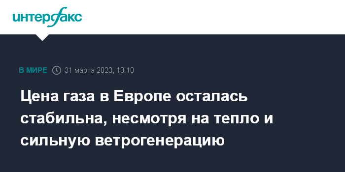 Москва. 31 марта. INTERFAX.RU - Цена газа в Европе всю неделю сохраняет стабильный уровень на отметке около $480 за тысячу кубометров, и волна тепла в четверг не смогла обрушить цены.