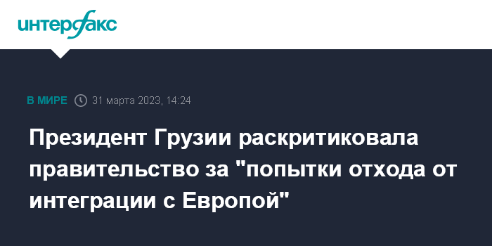 Москва. 31 марта. INTERFAX.RU - Президент Грузии Саломе Зурабишвили обвинила исполнительную власть и парламентское большинство в попытках изменить политический курс страны.